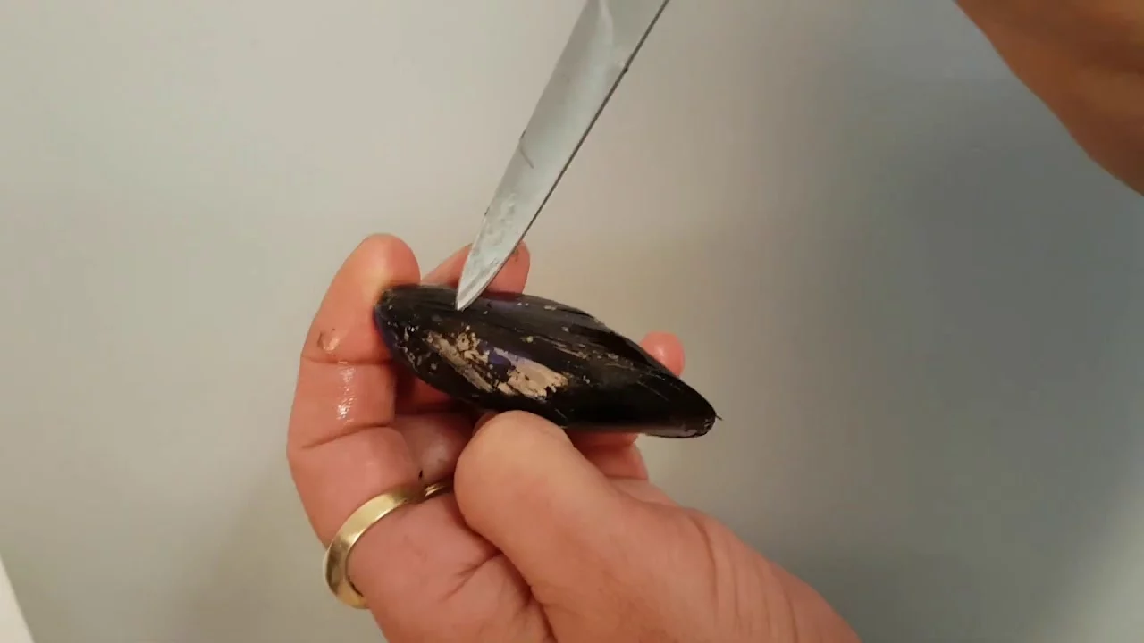 Pour cela tenir la moule, la charnière vers vous, pincez avec votre pouce et l’index, le byssus situé sur le côté droit de la moule, tendez le byssus latéralement et, d’un coup sec, tirez le long de la coquille jusqu’à rupture du byssus.